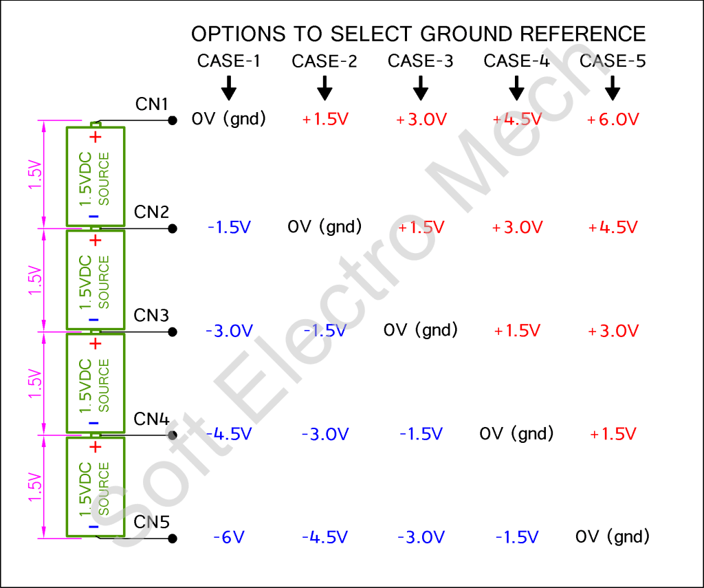 Actually, the voltage levels mentioned above are relative voltage levels to each other. If you observe the figure below, four cells are arranged in series, each with 1.5Volts DC. Each cell is marked as +ve and -ve on both the ends. You may observe that, by selecting the connections (CN1 to CN5) as ground reference, the Positive and Negative Voltages vary.