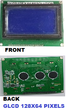The GLCD (Graphical Liquid Crystal Display) has good viewing size of pixel size (0.48mm x 0.48 mm) and screen area (66mm X33mm approx.). The screen is logically divided into two panes as 64X64 pixels on left side and 64X64 pixels on right side, which makes 128X64 pixels in total. The left side pane is selected using CS1 pin and similarly right side pane is selected using CS2 pin. The data and command to GLCD is transmitted in 8 bit format by selecting RS pin setting high/low. The contrast of the display is controlled at pin-3 of GLCD, through a trim-pot connected between -10VDC ( available at pin 18 of GLCD) and ground.