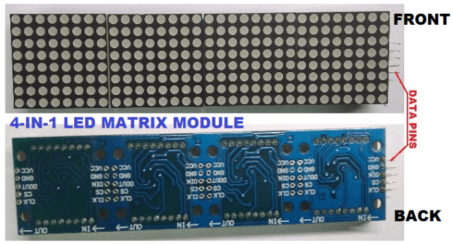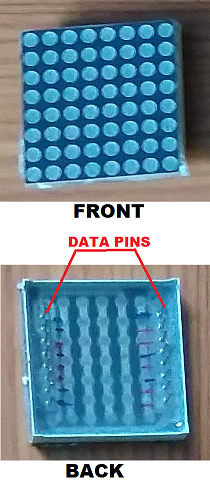 64 LEDs are arranged in 8 X 8 matrix format in a square block. By selecting pins at the back side of the block, required LEDs in combination of 8 rows and 8 columns may glow.